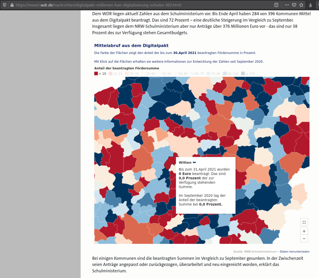 Jetzt lese ich gerade beim WDR diesen Artikel und muss feststellen, dass lt. den Angaben des Schulministeriums NRW bisher noch keine Anträge von der Stadt Witten zur Förderung eingegangen sind bzw. auch keine Fördersummen abgerufen wurden.