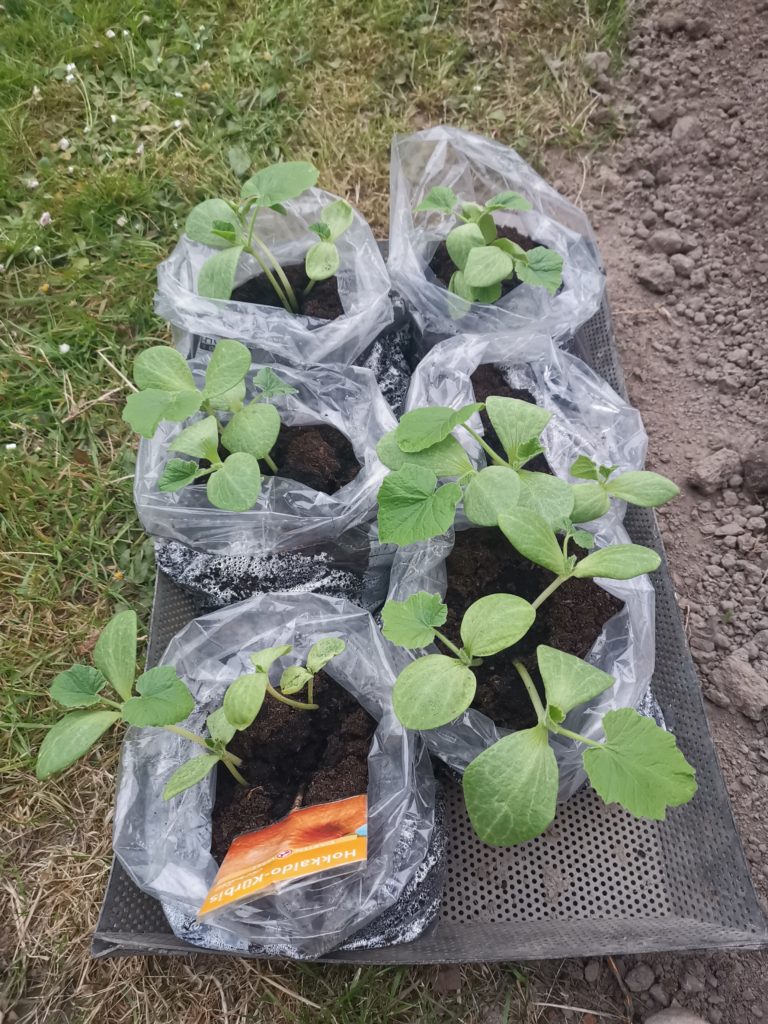 Empfehlungen gefolgt, haben wir die einzelnen Kürbissamen in Beuteln ausgesäht. Durch die Fussboden Heizung im Arbeitszimmer (aka Karminzimmer) sind diese dann innerhalb der letzten 5 Wochen sehr gut gewachsen. Sodass die jungen noch relativ zerbrechlichen Pflanzen langsam bereit waren raus in den Garten verpflanzt zu werden.