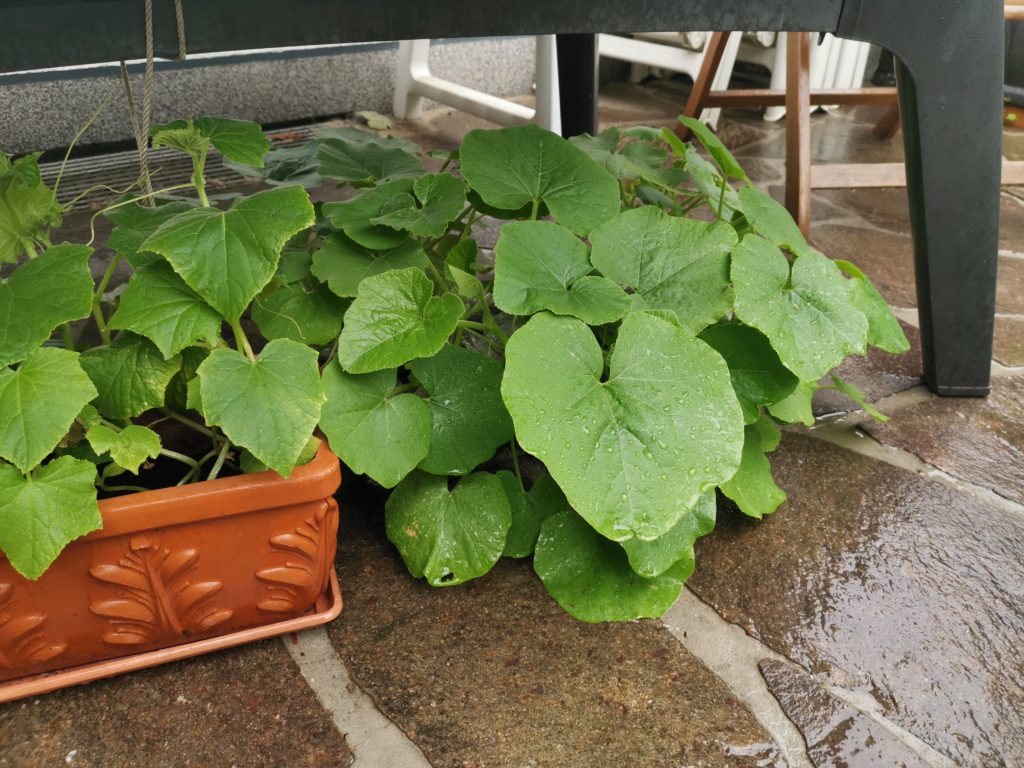 Als der Tag X dann kam, hatte das Wetter leider noch nicht mit gespielt und wir haben die jungen Kürbispflanzen noch ein paar Tage unter unserem Tisch draußen an das Wetter gewöhnt.