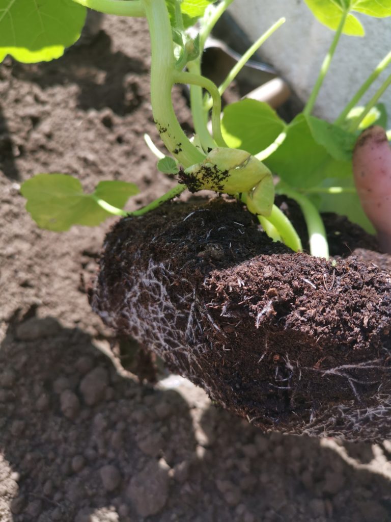 Nach dem die kalte Regenfront dann vorbei gezogen ist, haben wir die Kürbispflanzen dann in das dafür bereits vorbereitete Erdreich eingebracht.