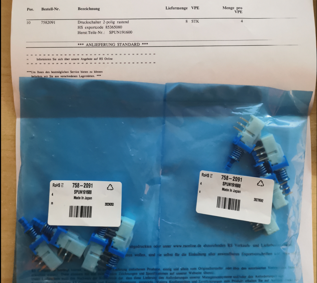Bei RS-Components hatte ich die originalen ALPS Druckschalter bestellt. Diese haben ewig gedauert, da bei RS-Components anscheinend die linke Hand nicht wusste was die rechte Hand tat. Dann kam noch hinzu, dass gemäß Lieferschein und Artikelbeschreibung die gelieferte Menge nicht stimmt. Eine VPE beinhaltet 4 Schalter, wie auf dem Lieferschein und auf der Website beschrieben. Geliefert wurden angeblich 8 VPE, also 32 Schalter. Angekommen sind jedoch nur 8. Das ist aber noch mal ein anderes Thema und wird gerade eskaliert.