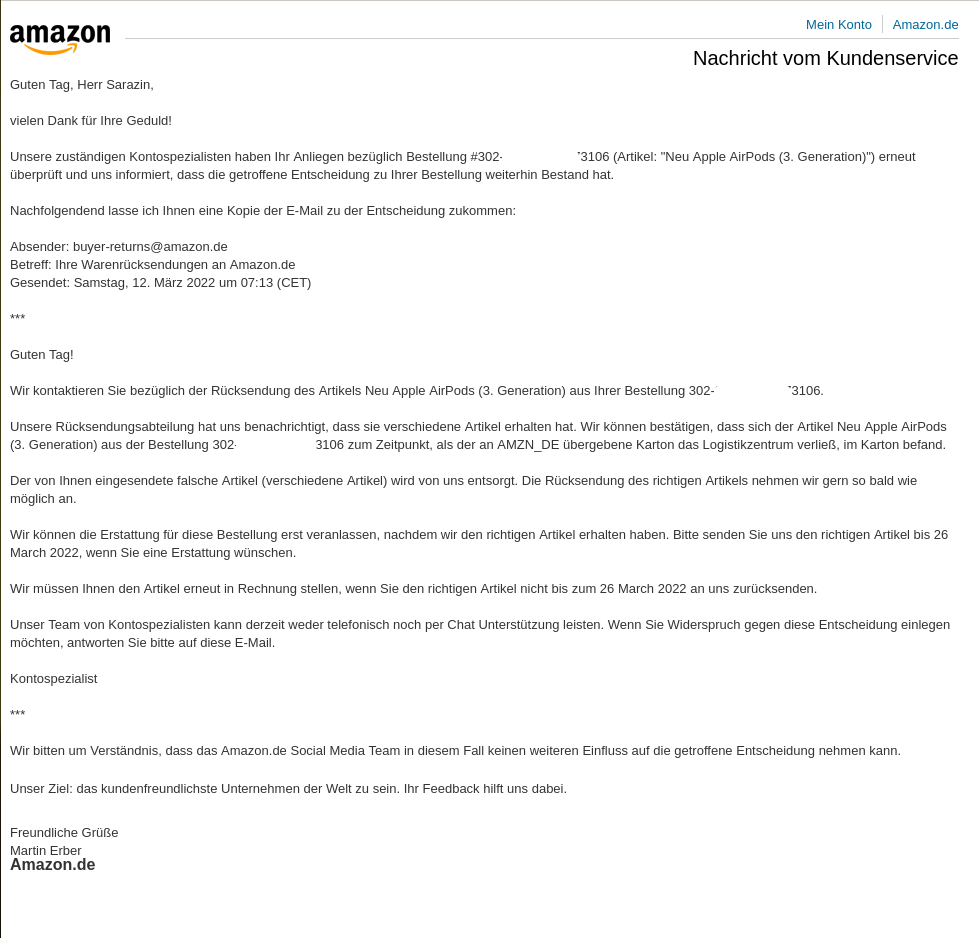 Wie schon in https://blog.darkhawk.de/?p=1576 geschrieben, gibt es dort derzeit offensichtlich irgendwelche Probleme mit einer angeblich falschen Retoure von mir. Gestern, am Samstag den 19.03.2022 um 22:43Uhr erhielt ich folgende Email von Amazon: